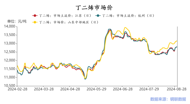 供给端:8月以来,顺丁橡胶上游原料丁二烯外放量减少明显,8月中旬以后,丁二烯库存去化,据海关数据,7月份丁二烯进口量环比下降57.04%,同比下降77.57%,进口量总体缩减明显,短期内供应偏紧格局难以改变;随着下游合成橡胶需求旺季的到来,丁二烯市场价格推高,BR橡胶成本上升。本周天然橡胶在多方推动下胶价呈阶梯型上涨,市场持看多及中性偏多心态占多数.一定程度上推动BR橡胶走强。