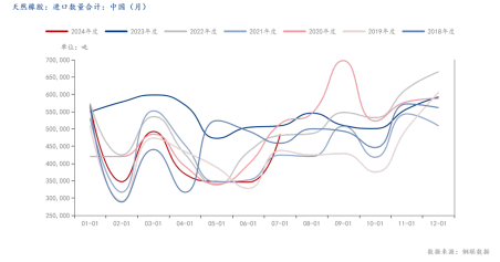 供给端:东南亚主产区受降雨持续影响,割胶速度放缓,新胶上量速度预计放缓。产区原料价格继续上涨,成本处于相对高位。国内7月橡胶进口量48.41万吨,同比下降4.91%,供应较往年同期处于相对低位。